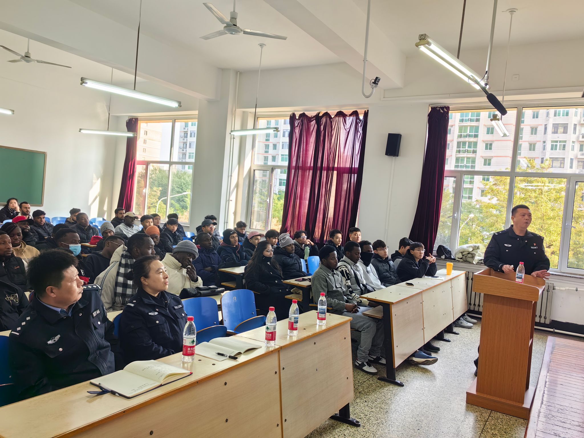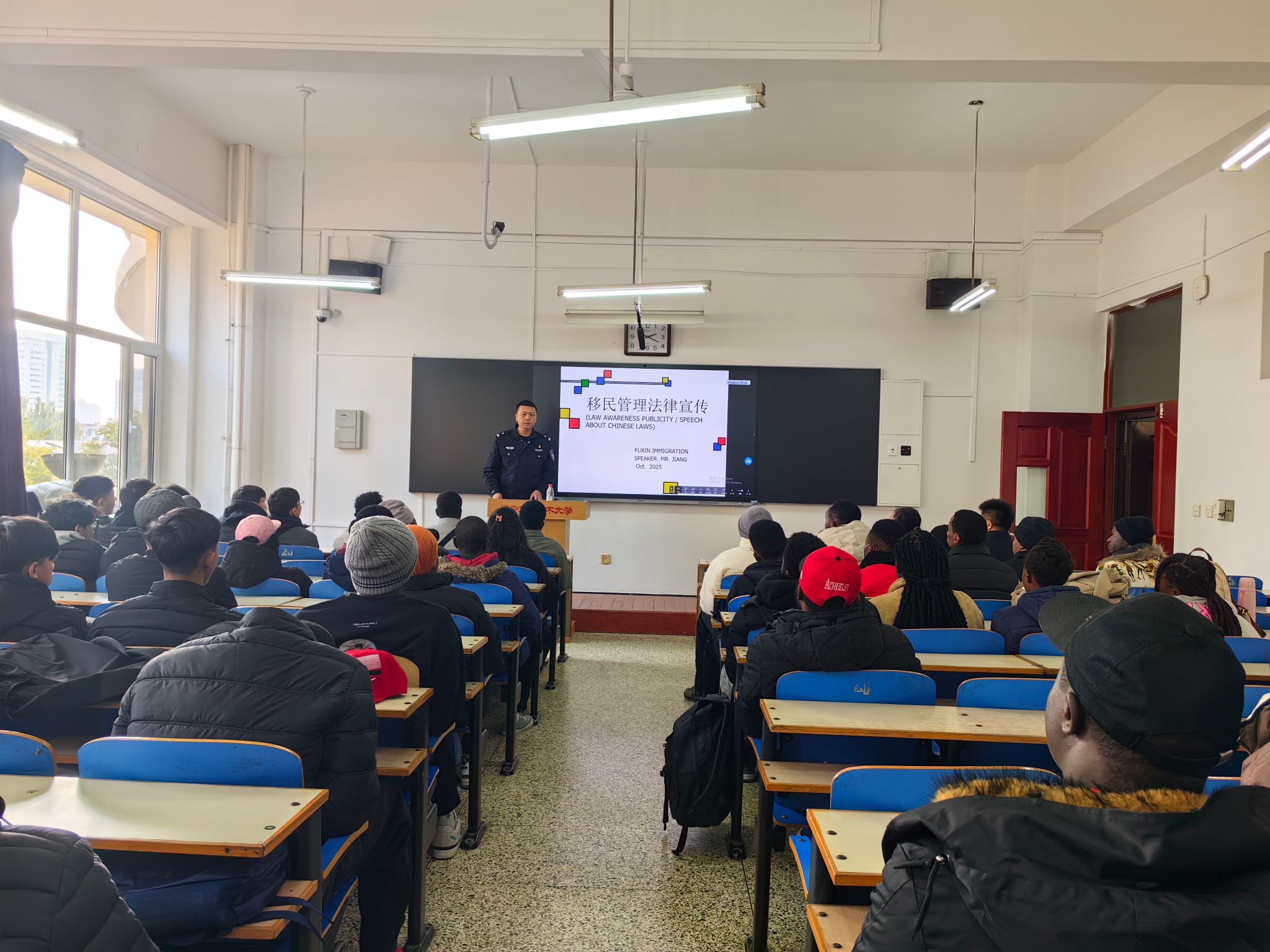 为帮助来华留学生更好地了解并遵守中国法律法规,保障其在校学习生活顺利开展,国际教育学院于2025年10月24日特邀阜新市公安局出入境管理支队蒋斌警官,为全体留学生举办了一场专题法律讲座。
